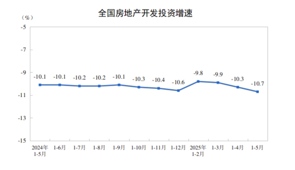国家统计局数据显示,1—5月份,全国房地产开发投资36234亿元,同比下降10.7%(按可比口径计算);其中,住宅投资27731亿元,下降10.0%。